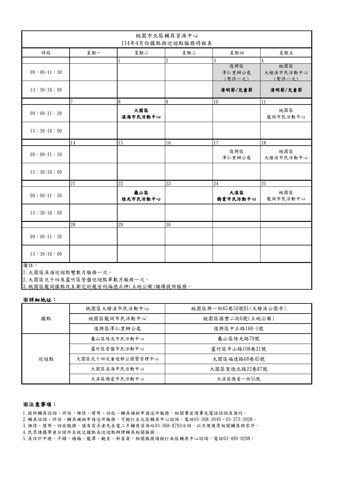 5.居住於中壢、平鎮、楊梅、龍潭、觀音、新屋者,相關服務請撥打南區輔具中心諮詢,電話03-489-0298。