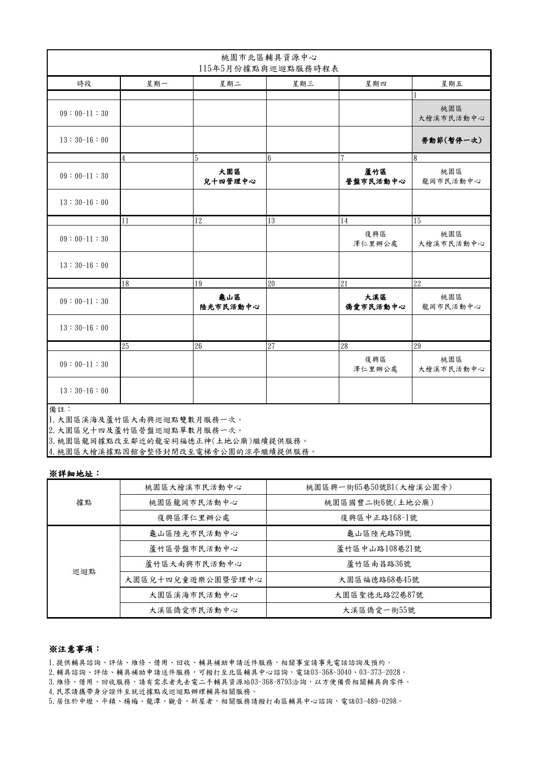 115年05月據點與巡迴點服務時程表