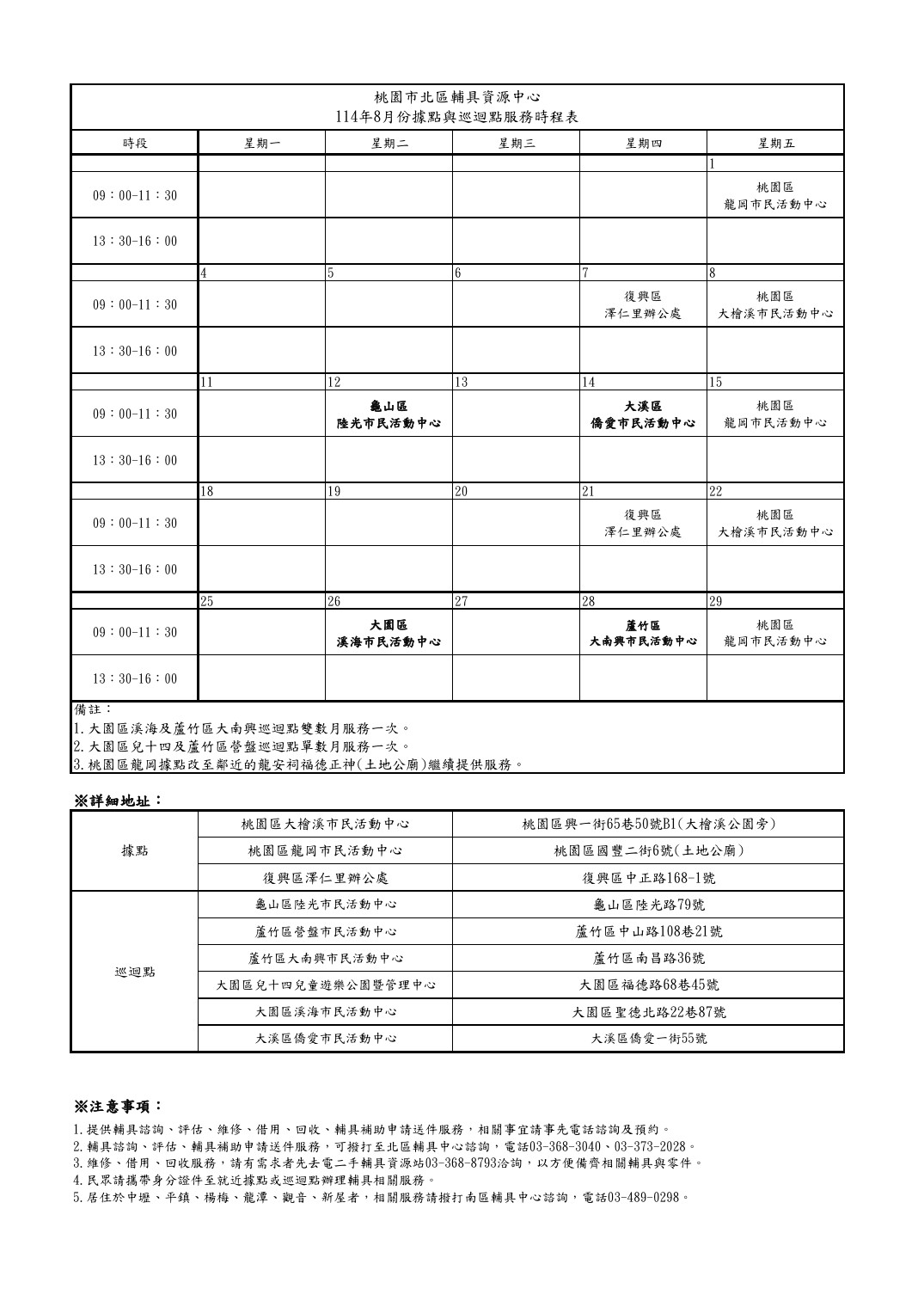 114年8月據點與巡迴點服務時程表