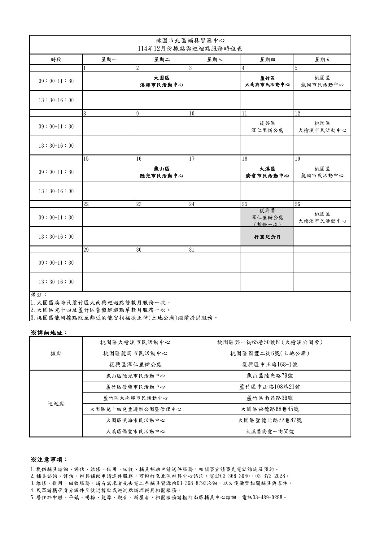 114年12月據點與巡迴點服務時程表